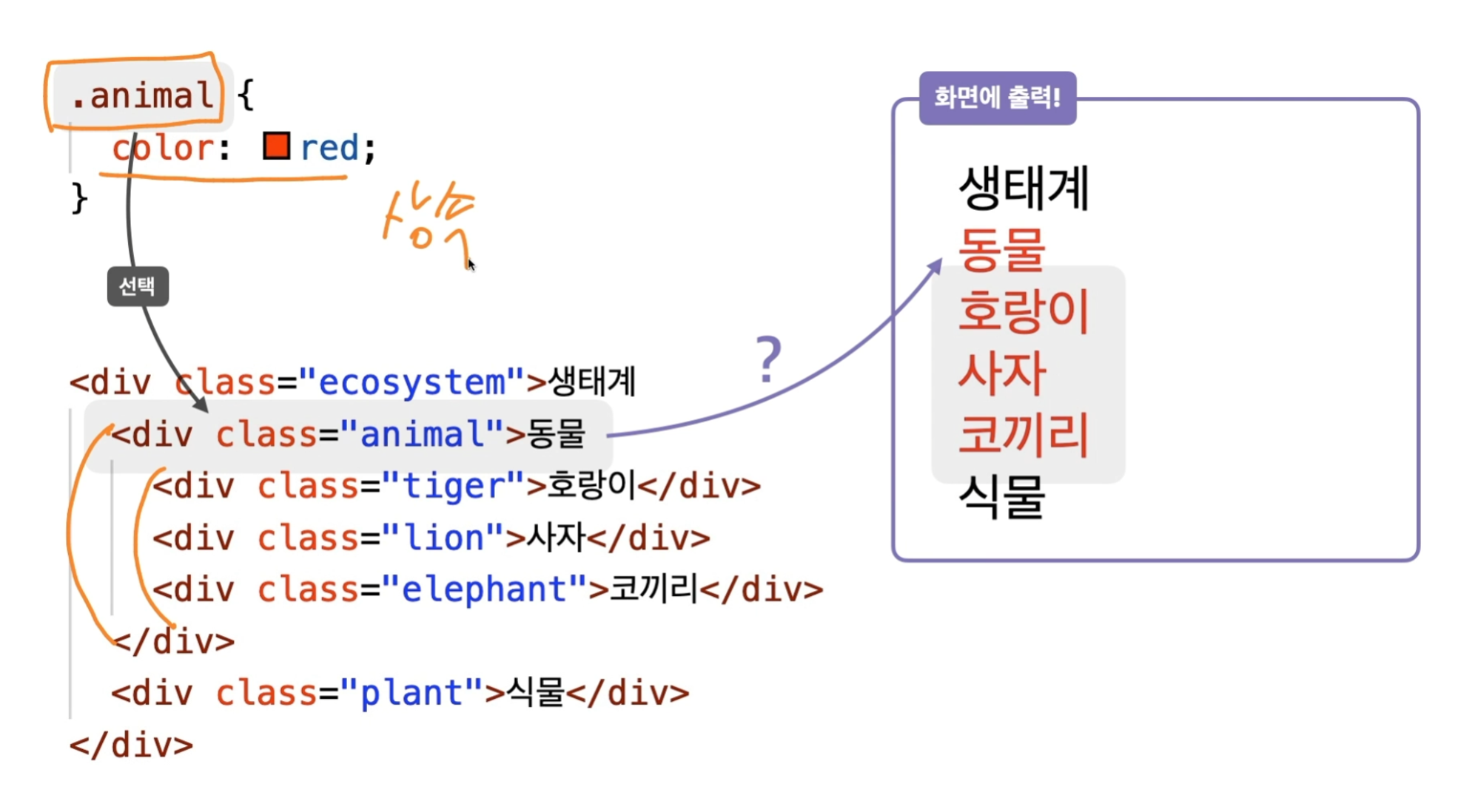- html에서 클래스로 animal을 정의 - css 에서 클래스 선택자를 통해 레드 컬러 부여 - animal은 호랑이, 사자, 코끼리 자식 요소들을 갖고 있기에 자식들 모두에게 레드 컬러 부여